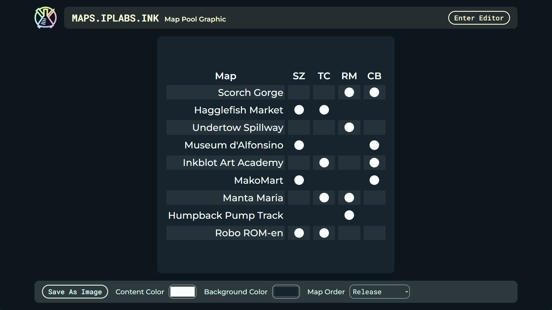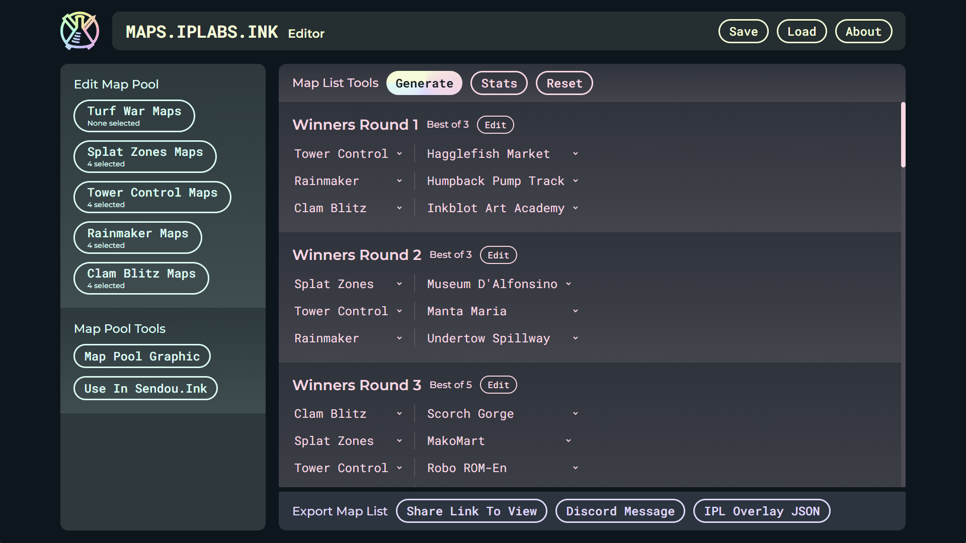- maps.ipl.ink: Create map pools for tournaments, maps for each set of a tournament, and generate graphics of a maplist. Exportable to sendou.ink’s maplist tool and as a link.